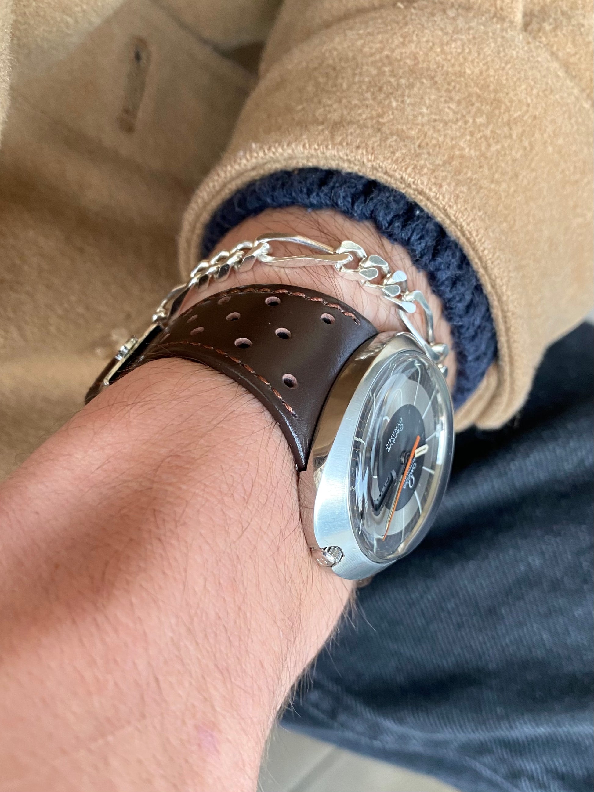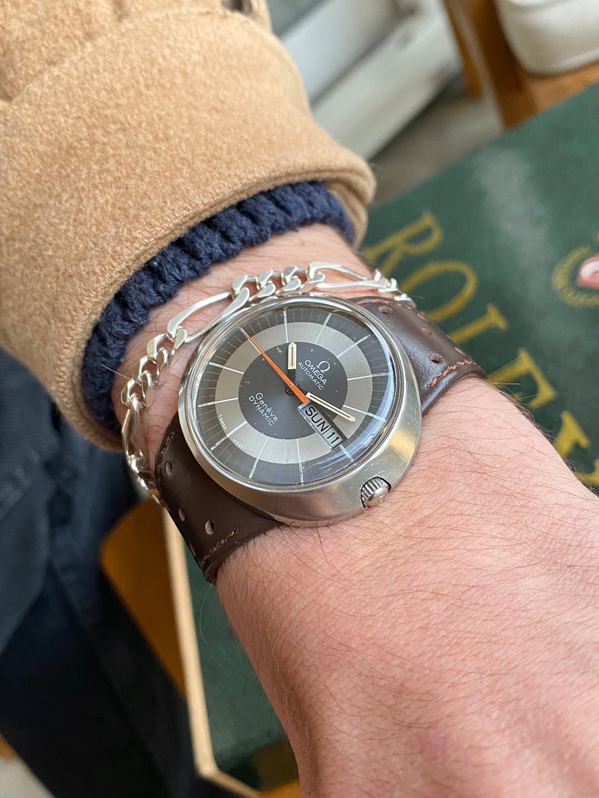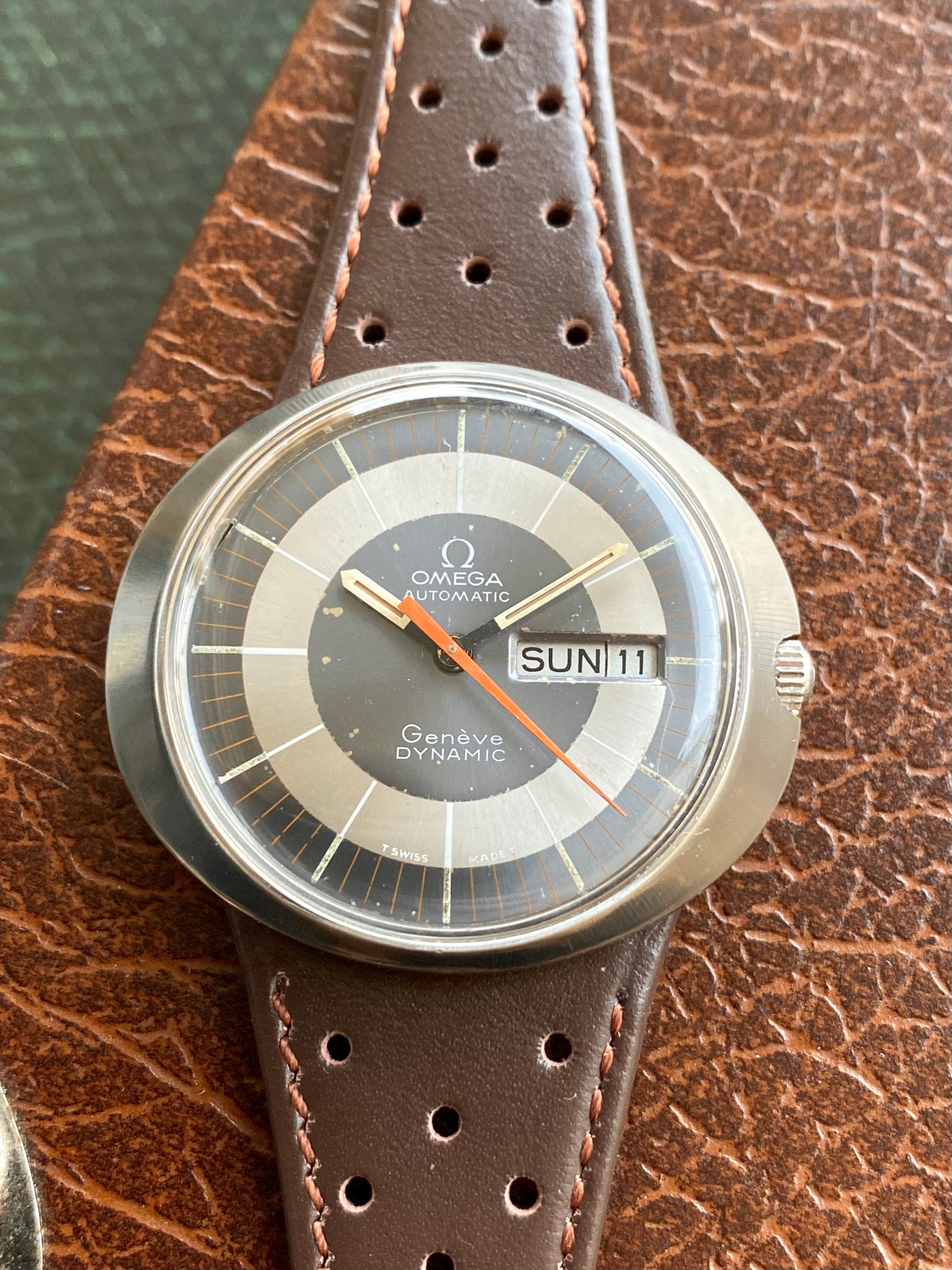 Superbe et authentique montre Suisse de marque Omega, modèle Genève Dynamic. Fabrication en 1969.