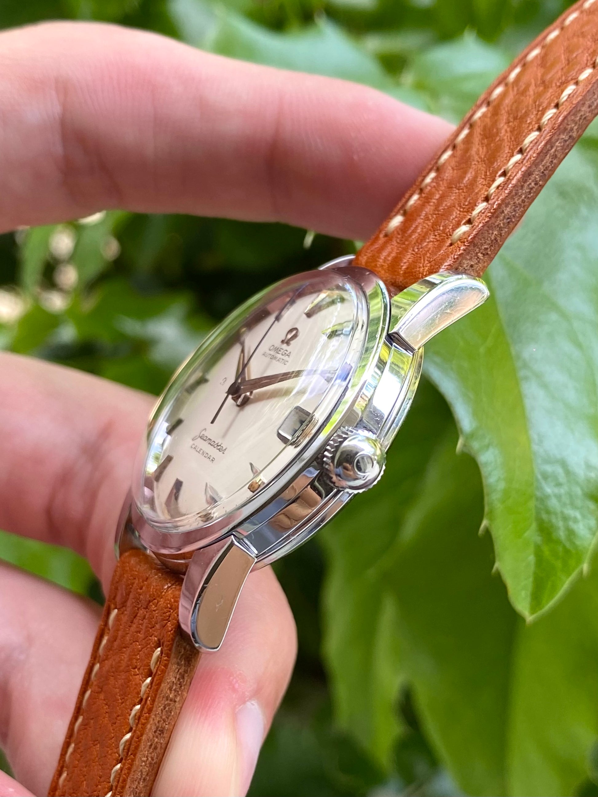 Splendide et authentique montre Suisse de marque Omega, modèle Seamaster Calendar. Fabrication en 1957.