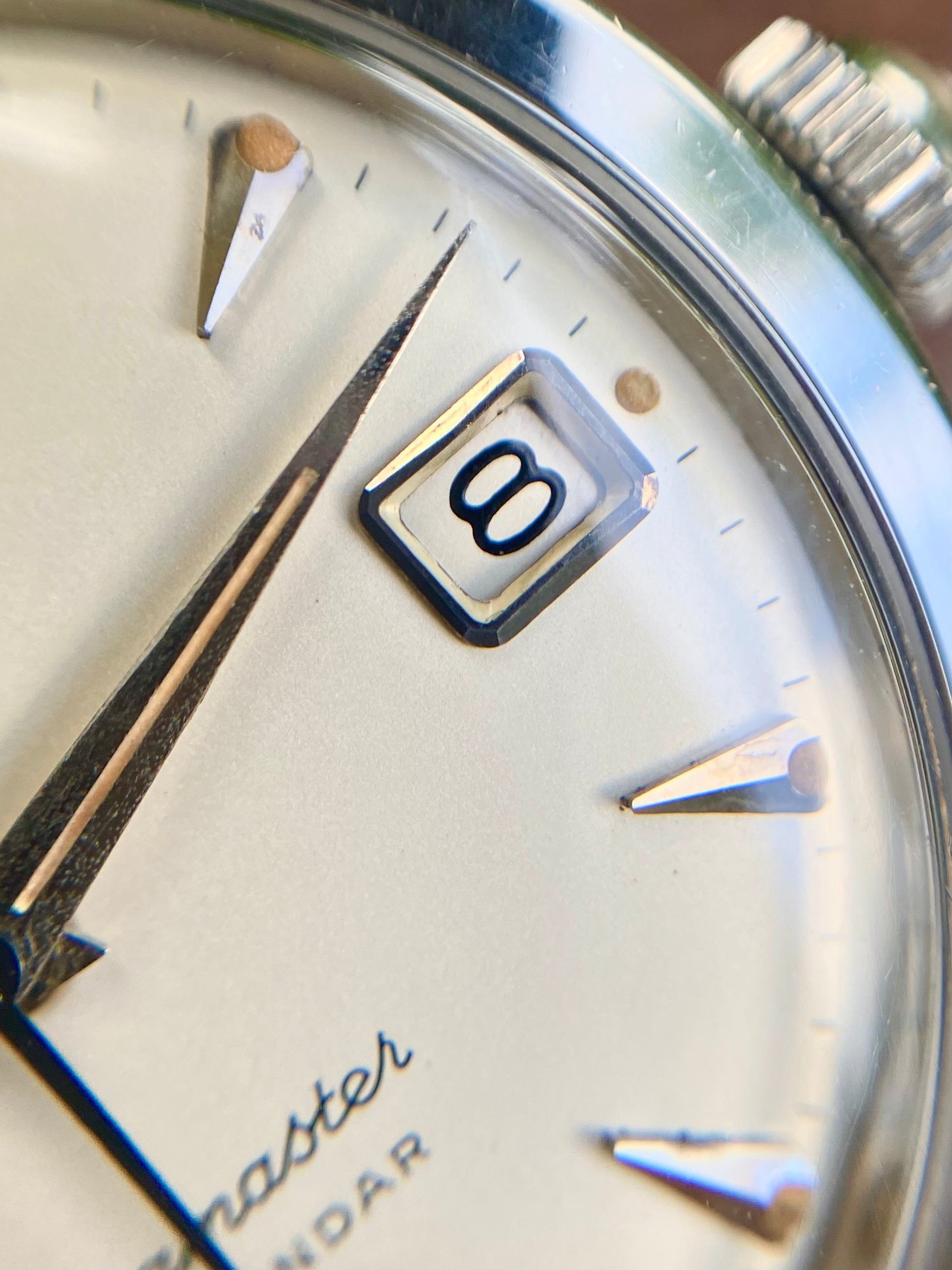 Véritable coup de coeur pour ce cadran, notamment pour ces index en Pointe de Flèche (ArrowHead). Extrémité des index et intérieur des aiguilles orangé, apportant beaucoup de charme à cette Omega.